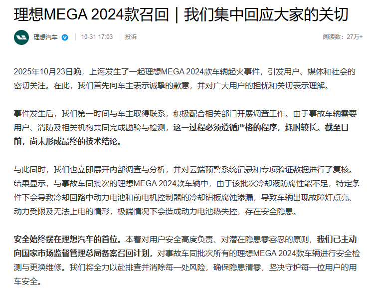 网易汽车10月31日报道 今日晚间,理想汽车发公告称:将召回2024年12月27日前生产的11411辆2024款MEGA。本次召回范围内的车辆,是由于该批次冷却液防腐性能不足,特定条件下会导致冷却回路中动力电池和前电机控制器的冷却铝板腐蚀渗漏,导致车辆出现故障灯点亮、动力受限及无法上电的情形,极端情况下会造成动力电池热失控,存在安全隐患。对此,将为召回范围内车辆免费更换冷却液、动力电池和前电机控制器。