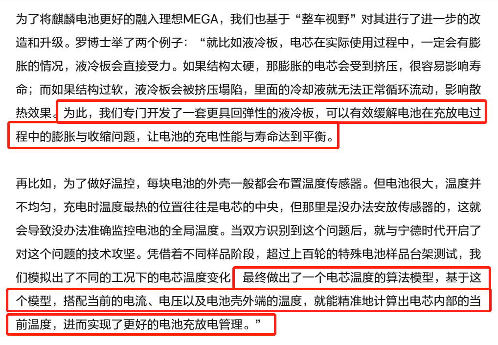 尤其是理想汽车和宁德时代联合开发时候,针对电池的散热系统以及冷却板结构、材质、布局以及安全验证所做的工作和努力。当时,理想汽车通过对液冷版材料和结构以及和电芯整体的布局,专门开发了一套更具回弹性的液冷板,可以有效缓解电池在充放电过程中的膨胀与收缩问题,让电池的充电性能与寿命达到平衡。同时持续攻坚的还有电池的温控,能够更好的实现电池充放电管理。