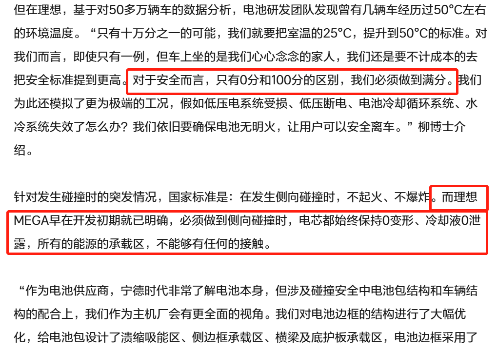 在安全方面,理想MEGA早在开发初期就已明确,必须做到侧向碰撞时,电芯都始终保持0变形、冷却液0泄露,所有的能源的承载区,不能够有任何的接触。也就是说,在整体的安全结构上,理想汽车和宁德时代联合开发的电池已经下了足够的功夫,并做了诸多验证。
